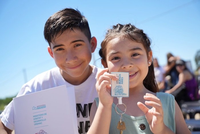 48 nuevas familias dolorenses recibieron las llaves de su casa de la mano del subadministrador del Instituto de la Vivienda, Hernán Ralinqueo; la subsecretaria de Desarrollo Urbano y Vivienda del Ministerio de Hábitat y Desarrollo Urbano, Adriana Esterelles, y el intendente Juan Pablo García.