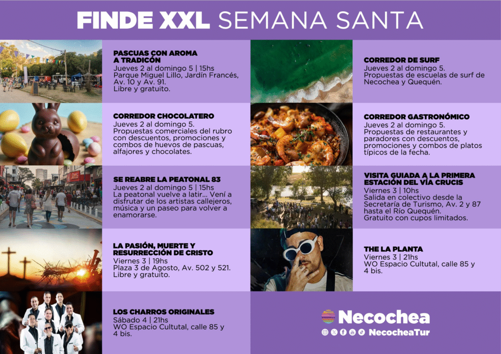 Durante todo el fin de semana también se podrá recorrer el Corredor de Surf, con clases, clínicas, música y actividades en torno al mar, y el Corredor Chocolatero y Gastronómico, con promociones especiales, sabores típicos de Pascua y propuestas para todos los paladares. Estas propuestas se pueden consultar a través de la página web www.necochea.tur.ar y redes sociales necocheatur.