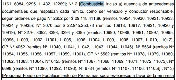 En detalle, la gestión fue objetada por la “ausencia de antecedentes documentales que respalden cada remito” y por el “incumplimiento de las normativas y procedimientos establecidos para la adquisición de combustible”.